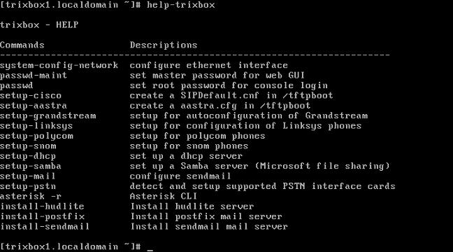 เมื่อ login เข้าสู่ระบบแล้วให้พิมพ์คำสั่ง help-trixbox ระบบจะแสดงคำสั่งต่างๆ สำหรับปรับแต่งระบบ