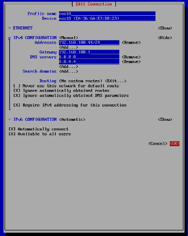 ใส่ Addresses, Gateway, DNS servers และ Options ต่างๆ แล้ว TAB ไปที่ OK แล้วกด ENTER