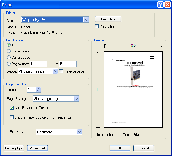 สั่ง print เอกสารโดยเลือก printer เป็น Winprint HylaFAX