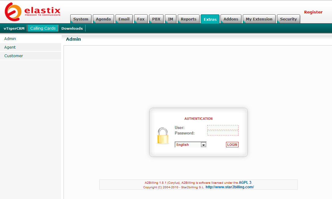 Login เข้าหน้า web login ของ Elastix แล้วไปที่Extras -> Calling Cards ใน Elastix 2.3 (a2billing 1.9.4) Username/Password จะเหมือนกันกับ Username/Password ที่เข้าหน้า web interface ของ Elastix