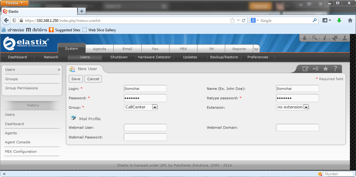 agent login เข้า Elastix server โดยใช้ username password ที่สร้างขึ้นใน Elastix -> System -> Users