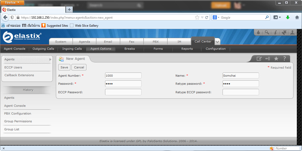 ขั้นตอนที่ 4 กลับมาที่ Call Center -> Agent Options -> Agents เพื่อสร้าง agents ตามจำนวนที่ต้องการ