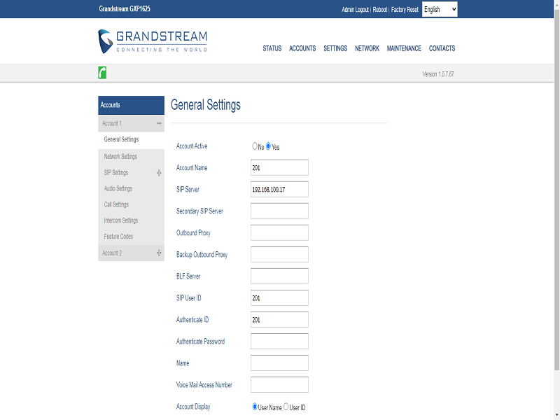 ใส่ Display Name = 201 หรือ จะเป็นชื่อผู้ใช้งานก็ได้ โดยใส่เป็นภาษาอังกฤษ เช่น Somchai ชื่อนี้จะไปแสดงที่ IP phone